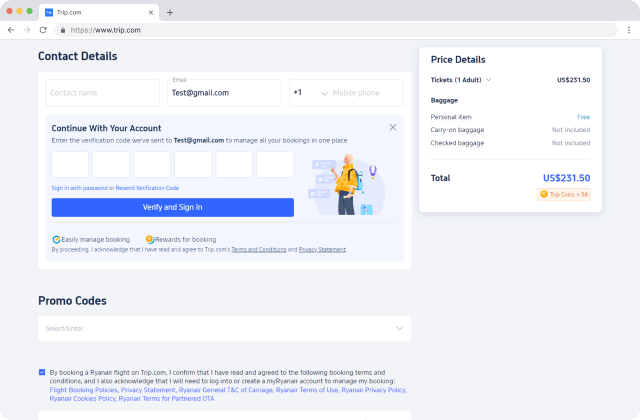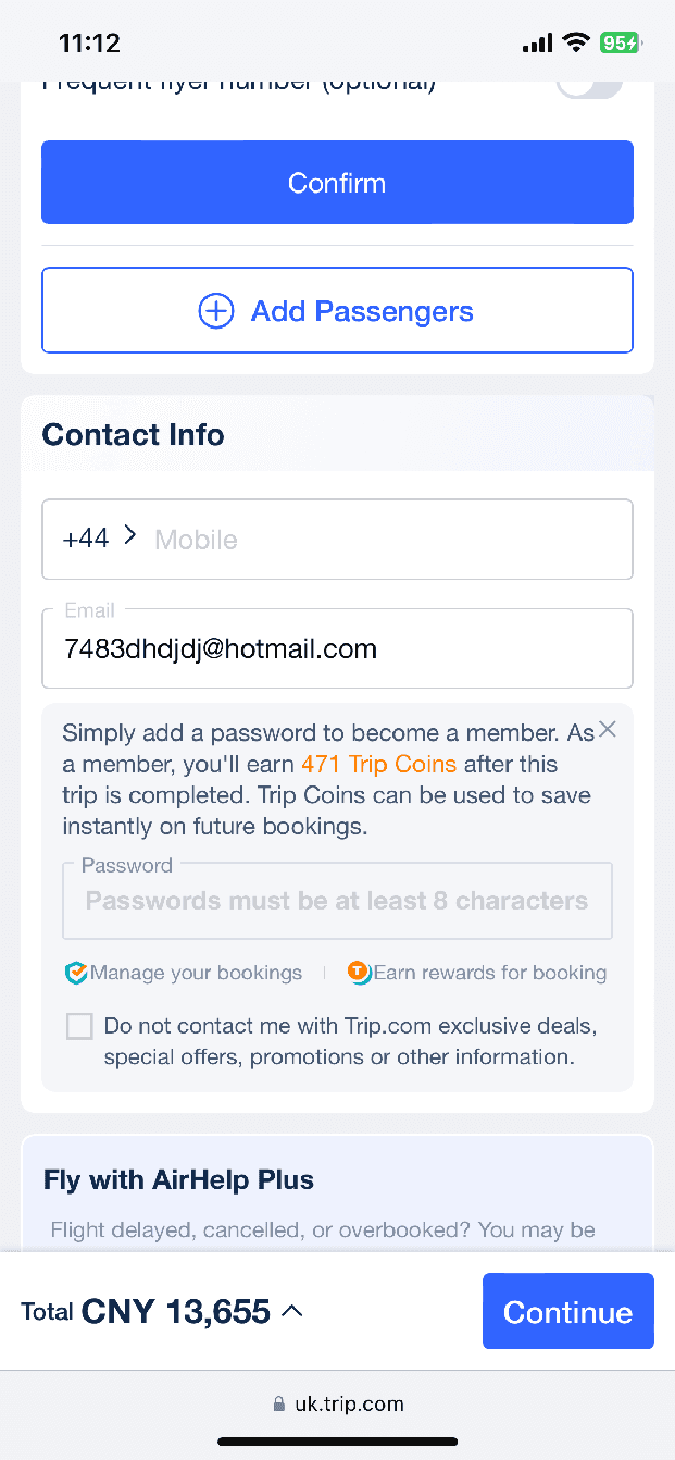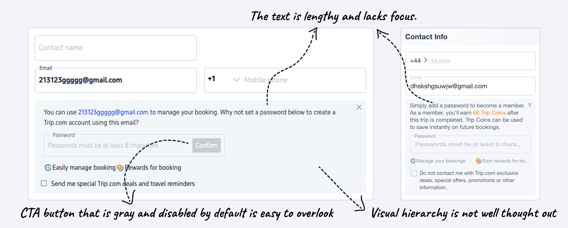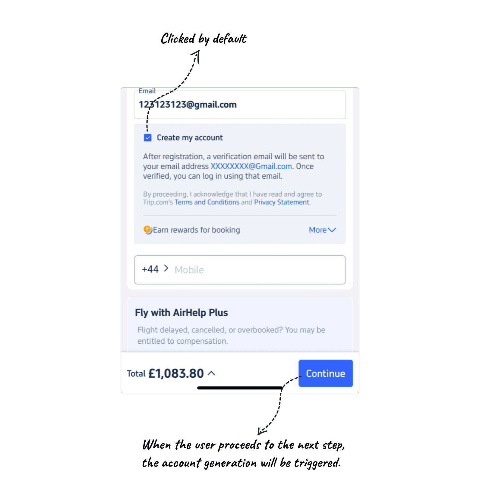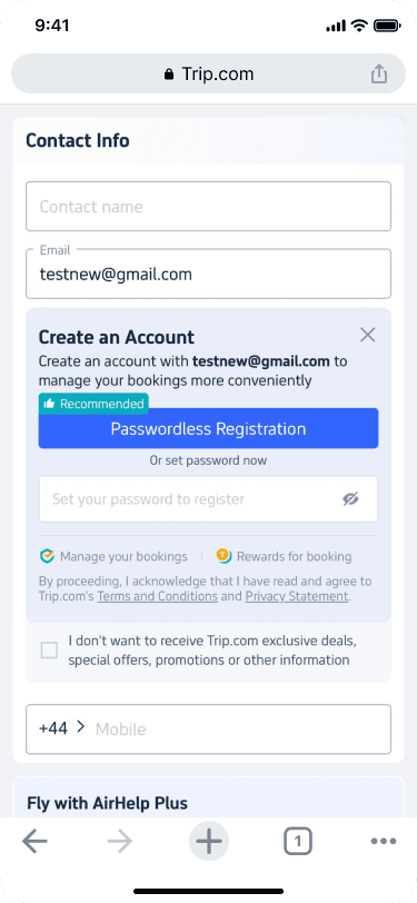 This figure indeed surpasses the previous 15.85%. However, I identified significant risks with this approach. Trip.com operates in 39 countries, which means it must comply with the legal regulations of each country. For common features like registration and login, many countries have strict laws prohibiting default selections for agreeing to privacy policies or subscribing to marketing emails. Thus, using a default-checked checkbox for contact email registration poses a clear legal risk.