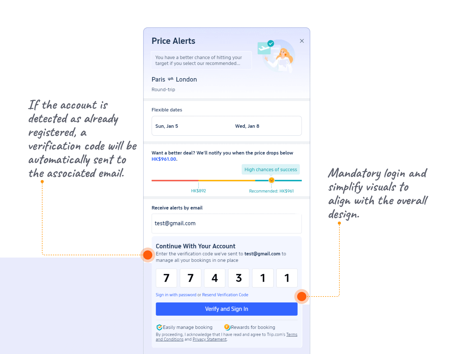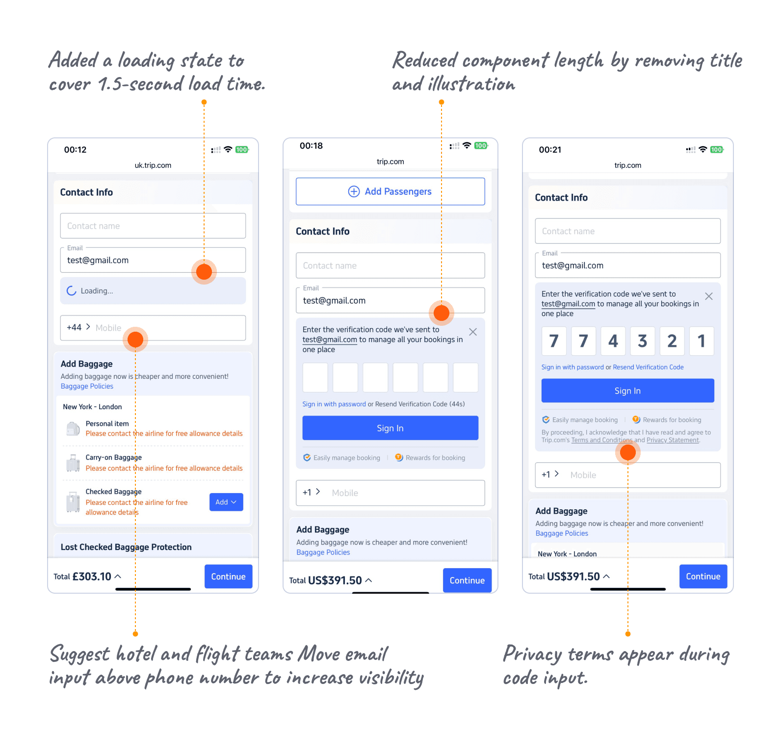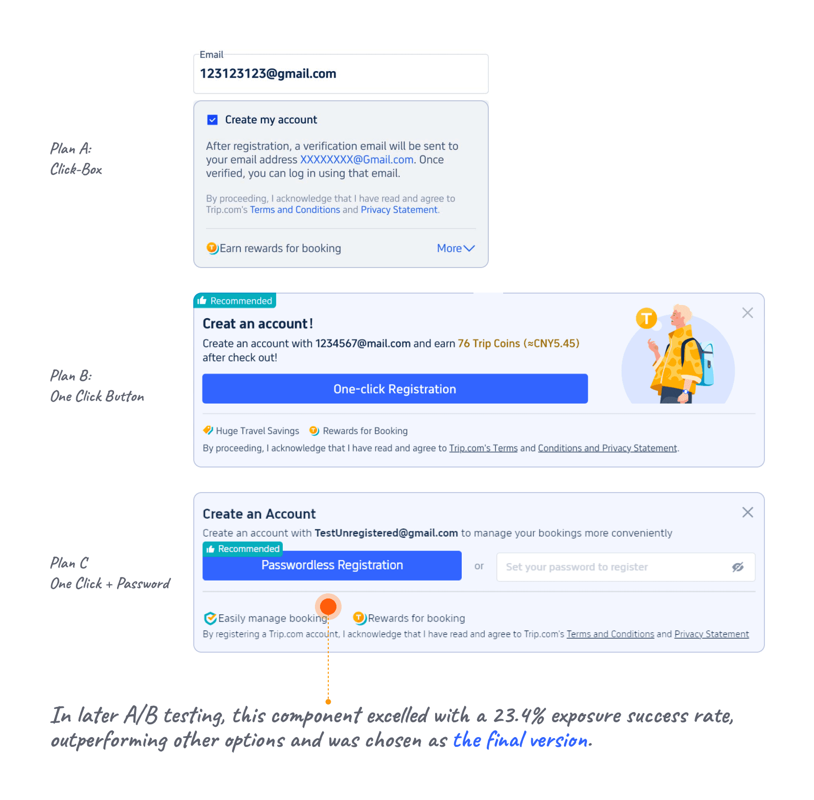 Using data analysis, competitive analysis, walkthrough, and A/B testing, I collaborated with product managers (this project, flight team, hotel team), UI designer, developer, and the legal team to propose and implement optimized solutions. Ultimately, I delivered high-fidelity UX interaction designs along with research findings and detailed design specifications. These efforts resulted in a significant improvement in registration and login rates for the component.