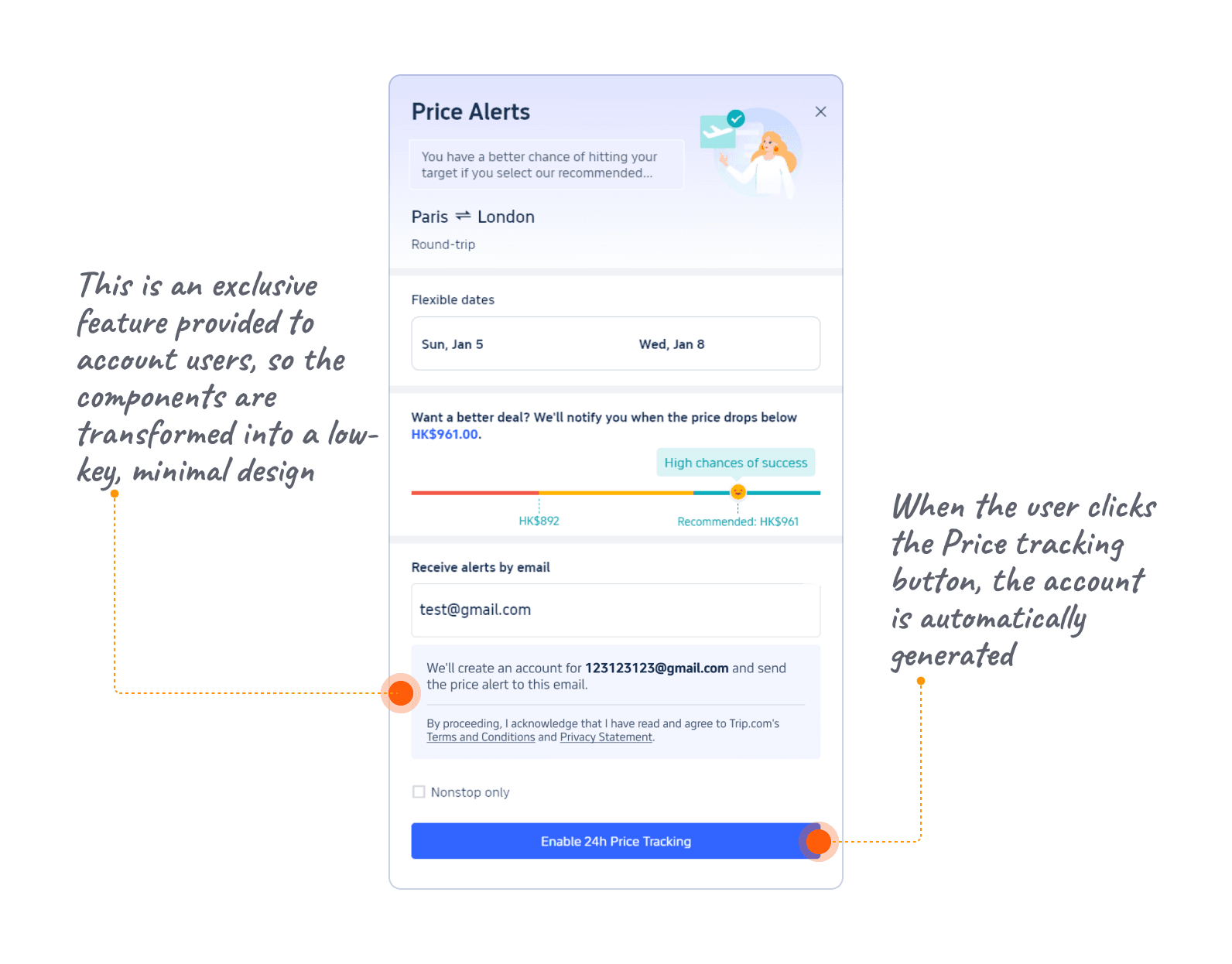 This component is designed to guide guest users (Unregistered or non-logged-in users ) to register or log in after they input an email address on Trip.com's web or mobile web platforms. (Note: This component is not required on the app as users must log in or register to place an order.)