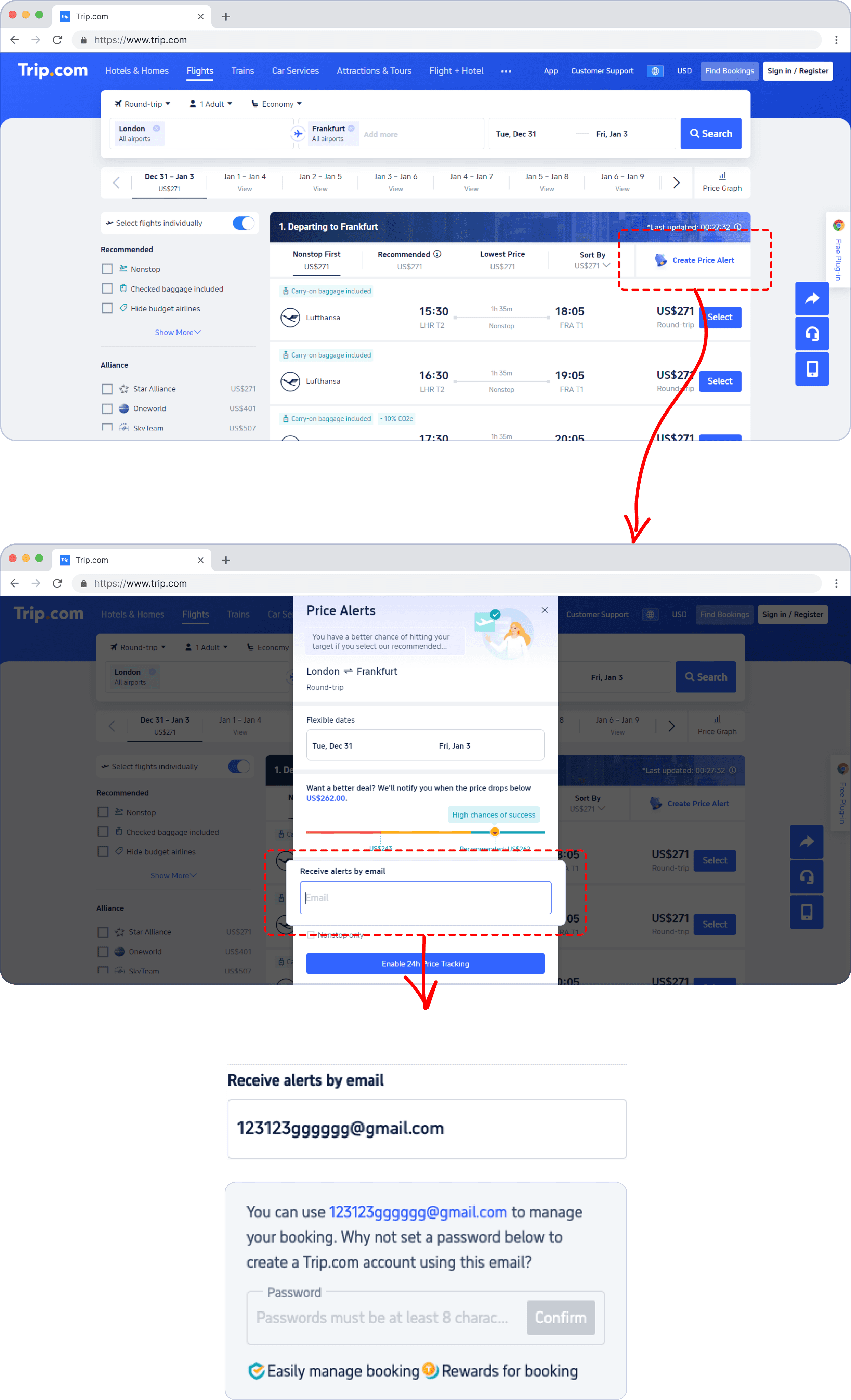 Price Alert Creating: Guest users provide email addresses in the "Create Price Alerts" feature of flight services.