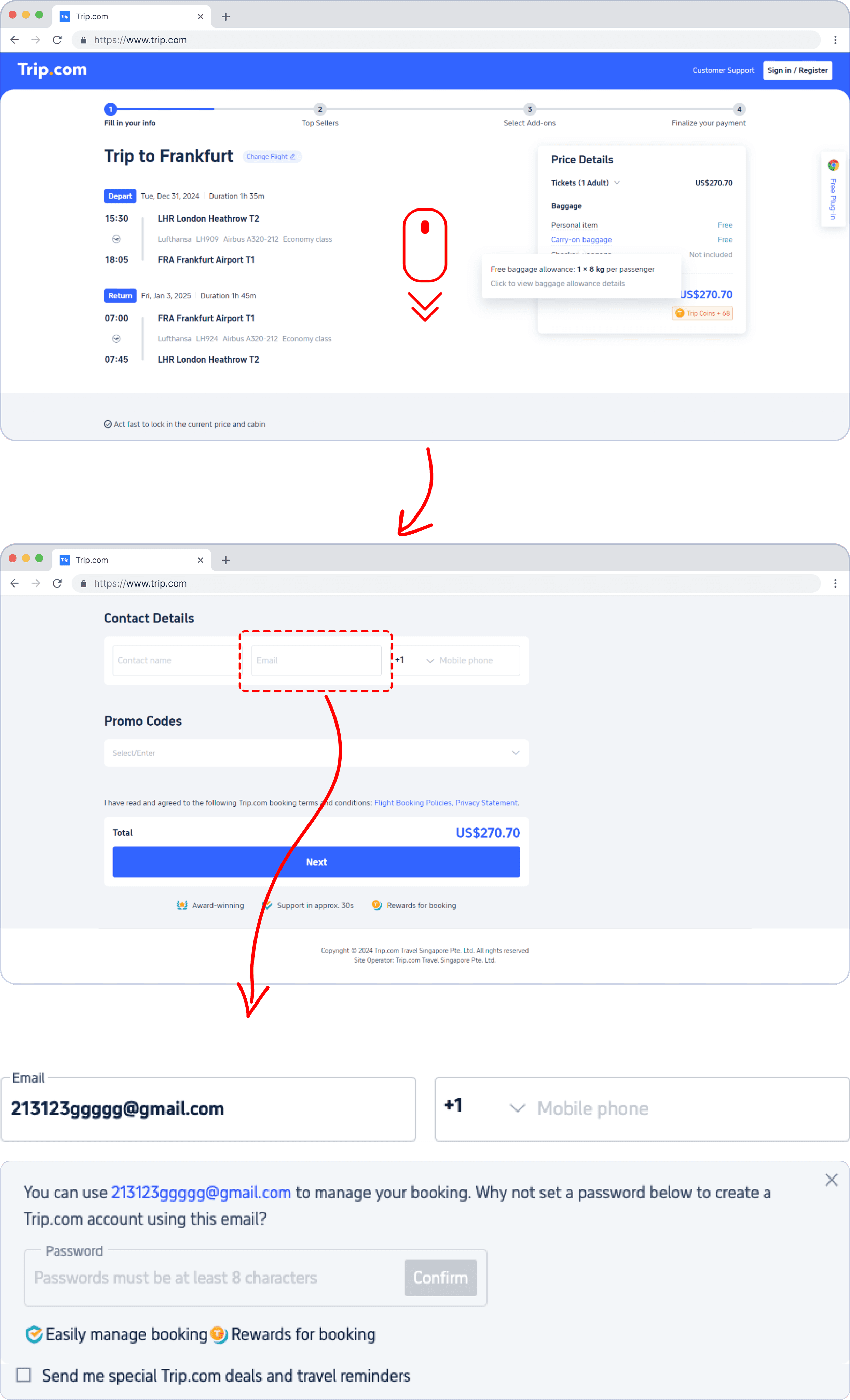 Booking Info Filling: Guest users input their email addresses on hotel or flight order forms.